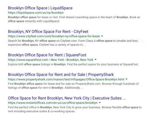 搜索 “Office Space Brooklyn”, 那么搜出来的结果全部都是交易型的:10个结果都是出租办公间的网站