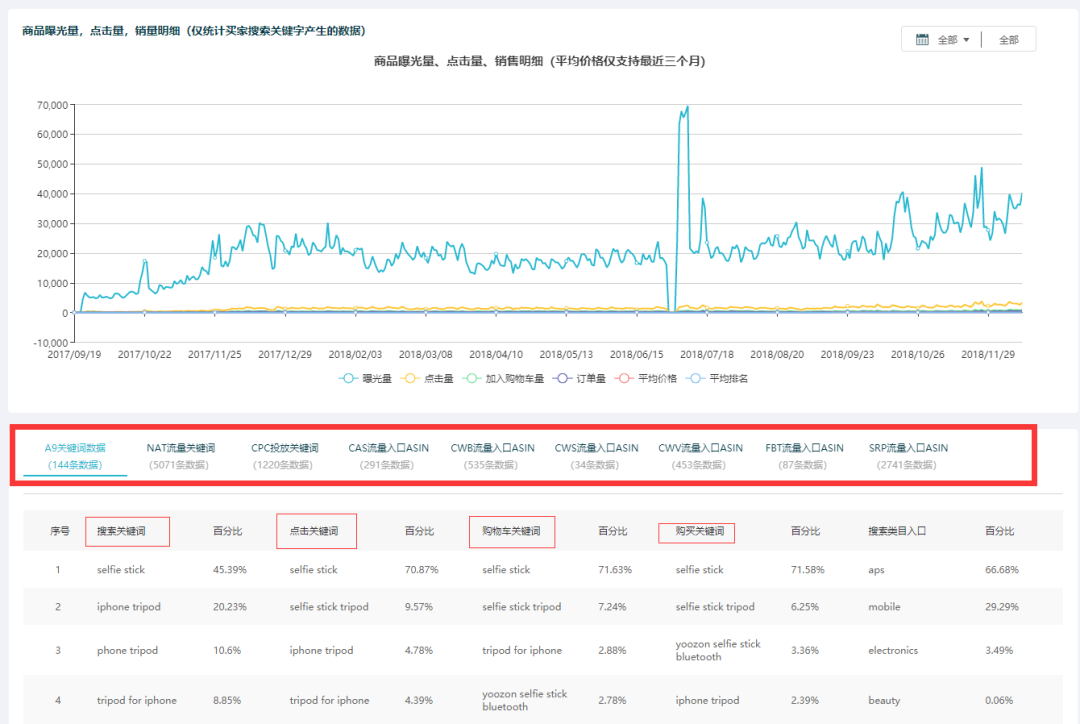 其中A9关键词数据可以展示此Asin购买关键词,购物车关键词,点击关键词和搜索关键词。一眼明了此Asin搜索流量的主关键词是什么,快速定位核心词。其中NAT流量关键词是指买家搜索到产品使用的关键词 其中CPC投放关键词是指买家搜索到广告产品使用的关键词