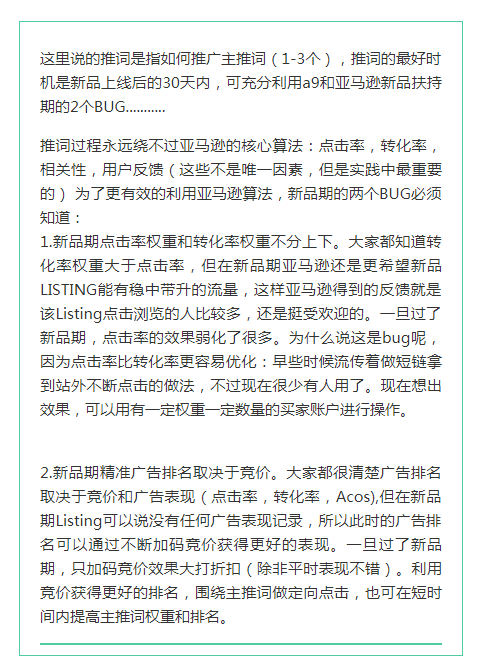 1.新品上线直接开大。一切对出单有效的能力范围内的方法(比如自动广告,比如大的COUPON,比如站外)一个也别放过,因为销量可以全面提高所有关键词排名。