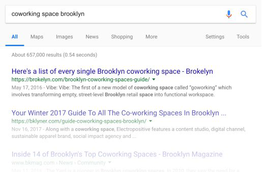 搜索 Coworking Space Brooklyn,结果大部分都是一些博客帖子,内容是关于这座城市里最好的协同工作办公间.表面上看,这两组关键词表达的意思是相似的,但是谷歌第一页的结果已经告诉我们:这两个相似关键词在表达不同的用户意图。