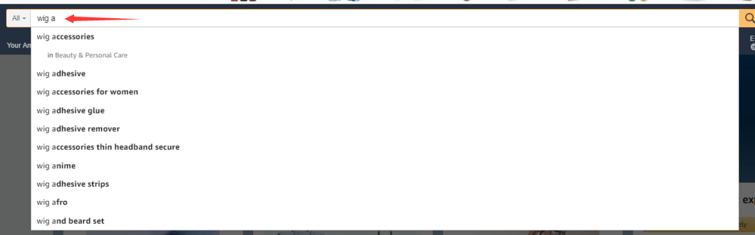 利用词根+a-z 的公式可以将有一定搜索量的关键词全部挖掘出来,然后将这些关键词记录到excel表中。比如我想把假发的一些关键词找出来,我会:wig a,wig b, wig c........