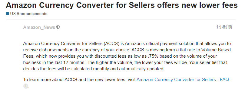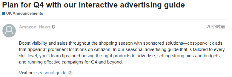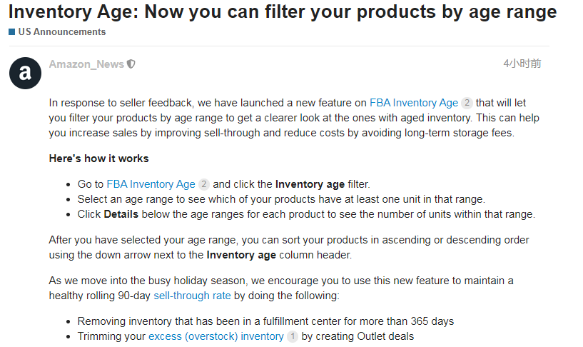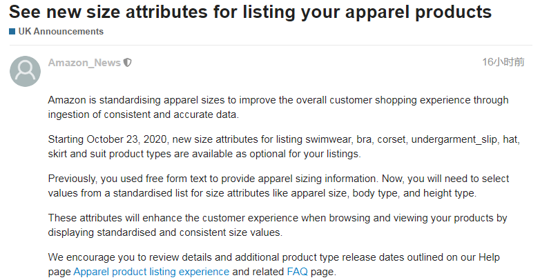 10月22日消息,亚马逊发布政策变更,现在英国、法国、意大利和西班牙站点已恢复接收和处理15公斤以上的单个产品和包裹。 图源/亚马逊卖家论坛 亚马逊表示,3月受疫情影响,为了保护员工的健康,对超15公斤的单个产品和包裹采取了临时限制收货、补货和运输措施。目前,已调整运营方式,可以在继续保护员工并遵守当地和国际卫生组织的安全准则的同时,接收、补充和运输这些产品。 要了解更多信息,请参阅临时限制重量超过15公斤的货物的更新: https://sellercentral-europe.amazon.com/gp/help/GH22WG4PU4L46JRD(复制到安全浏览器环境下打开) 二 卖家现在可以按 库龄范围筛选产品 为了回应卖家的反馈,亚马逊近日推出了关于“亚马逊物流库存年龄”的新功能。卖家现可以按库龄范围筛选产品,以更清晰地查看即将过期库存的产品。这可以通过改善销售率来帮助你提高销售量,并通过避免长期仓储费来降低成本。 图源/亚马逊卖家论坛 运作方式如下: 进入“亚马逊物流库存年龄”页面,并单击【库龄】筛选条件 选择一个库龄范围,查看你的哪些产品在该范围内至少存在一件产品 单击每件产品的库龄范围下方的【详情】,以查看该范围内的产品数量 选择库龄范围后,你可以使用【库龄】列标题旁边的向下箭头按升序或降序对产品进行排序。 在进入繁忙的假日购物季期间,亚马逊建议你利用这一新功能保持90天的良好出售率,具体操作如下: 移除已存在于运营中心中超过365天的库存 通过创建折扣交易清理多余(积压)库存 三 10月23日起, 服装品类的部分产品将执行新尺寸标准 10月20日,亚马逊发布服装产品新尺码属性公告,正在对服装尺寸进行标准化,以通过获取一致且准确的数据来改善整体客户购物体验。 图源/亚马逊卖家论坛 从2020年10月23日开始,swimwear(泳衣)、bra(文胸)、corset(紧身胸衣)、undergarment_slip(贴身内衣,如衬裙)、hat(帽子)、skirt(裙子)和(西服套装)产品类型的新尺寸属性可供选择。 以前,你可以使用免费格式文本来提供服装尺码信息。现在,你需要从一个标准化的列表中选择尺寸属性,如服装尺寸、体型和身高。 通过展示标准化和一致的尺寸值,这些属性将增强客户在浏览和查看产品时的体验。 你可以查看服装产品列表体验和常见问题页面获取帮助: https://sellercentral-europe.amazon.com/gp/help/GM6YJ5XPA58U99XM(复制到安全浏览器环境下打开) 常见问题页面上概述的详细信息和其他产品类型的发布日期: https://sellercentral-europe.amazon.com/gp/help/GQ2JFF7DLWVHU7YX(复制到安全浏览器环境下打开) 四 亚马逊删除大批万圣节违规面具 卖家须遵守平台销售政策 据外媒报道称,亚马逊上一款万圣节产品遭到英国消费者的强烈抵制,该产品看起来像冠状病毒的万圣节面具,来自中国广东的一位卖家。 船长了解到,目前亚马逊已经删除这些不合适的产品,并回应表示,所有卖家都必须遵守平台销售政策,否则将受到包括删除账户在内的惩罚。 针对即将到来的万圣节,不少亚马逊卖家开始销售与万圣节相关的产品,船长再次提醒各位卖家,切记不要踩平台红线,出现违规销售行为。 五 亚马逊卖家大学可查看 往期所有的Amazon Accelerate会议内容 近日,亚马逊美国站发布了一则公告,现在卖家可在亚马逊卖家大学查看往期所有的Amazon Accelerate会议内容。 在这项会议中,亚马逊分享了关于推出新产品、建立品牌和首次设置赞助广告活动的技巧等内容,以及回答了关于亚马逊广告和活动优化的常见问题。 内容涵盖: 1、通过广告帮助促进销售; 2、通过亚马逊广告建立你的品牌; 3、如何在亚马逊上宣传新产品; 4、广告展示的最佳方案; 5、开店入门指导。 六 亚马逊货币转换器为卖家 提供了新的更低的费用 10月20日,亚马逊修正了10月8日至10月12日发布的卖家专用货币转换器(Amazon Currency Converter for Sellers,下文简称ACCS)公告。此修正规定折扣率仅是非人民币货币。 图源/亚马逊卖家论坛 ACCS是亚马逊的官方付款解决方案,现在允许你根据选择的货币接收付款。ACCS正在从固定费率改为按量收费,可按照你过去12个月的业务量为你提供低至0.75%的非人民币货币折扣率。数量越高,你的费用就越低。决定费用的卖方级别将每月计算并自动更新。 要了解有关ACCS和新的更低费用的更多信息,请访问常见问题页面: https://sellercentral-europe.amazon.com/gp/help/G200381250(复制到安全浏览器环境下打开) 七 亚马逊发布 第四季度广告季节性指南 日前,亚马逊发布了借助广告来提高整个假日购物季卖家的品牌曝光和商品的销量的解决方案,例如,在亚马逊的显著位置投放按点击付费的广告。亚马逊表示,在针对每个技能水平量身定制的季节性广告指南中,你将学习到一些技巧,以选择合适的产品进行广告宣传,设置有竞争力的出价和预算,并在第四季度及以后的实际进行有效的广告活动。 图源/亚马逊卖家论坛 获取亚马逊广告季节性指南,请访问: https://amazonadvertising.turtl.co/story/shopping_guide_gb/?ref=%20sspa_uk_s_acq_SCPDInteractiveGuide(复制到安全浏览器环境下打开) 八 亚马逊将在堪萨斯州 开设2个新的运营中心 亚马逊宣布,计划在堪萨斯州开设两家新的运营中心,每个设施面积为100万平方英尺,将用于满足大宗或大型客户的物品,如露台家具,户外设备和地毯。 据悉,新的运营中心预计将于2021年启动,可创造1000多个新的全职工作,并将提供行业领先的