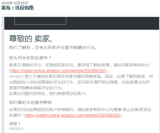 另一个美亚卖家称,自己也收到邮件,警告帐户有被停用的风险。但不同是,这位卖家被警告的内容有点不一样。邮件内容显示他违反了亚马逊的行为准则。具体行为包括影响客户的评分和评论,操纵销售排名,人为操控流量等等。