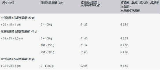 亚马逊卖家可以根据自己的商品尺寸(cm)和外运发货重量和以下表格对应来查看自己需付的配送费。