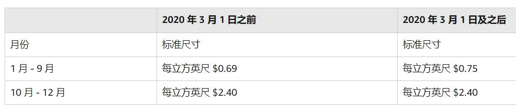因为10-12月份是亚马逊平台的旺季,所以月仓储费用会高一些。以上是2020年3月1日之前按照此标准,2020年3月1日及之后,标准尺寸:1月-9月是每立方英尺$0.75,10月- 12月是每立方英尺$2.40。大件商品当前的月度仓储费价目表将保持不变。