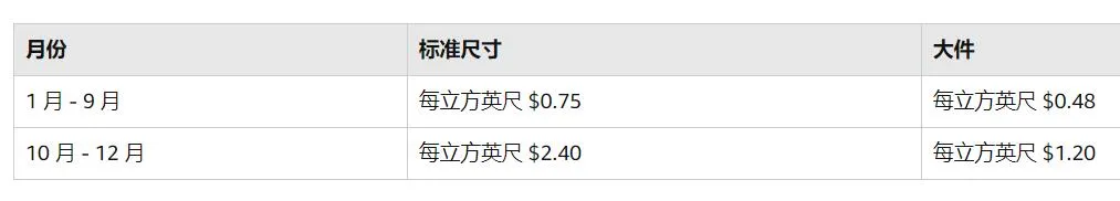 1月-9月,标准尺寸商品,每立方英尺$0.69;大件商品,每立方英尺$0.48。10月-12月,标准尺寸商品,每立方英尺$2.40;大件商品,每立方英尺$1.20。