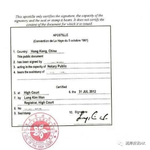 2.拿到非海牙公约组织成员国使用,需先经过香港国际公证人公证,然后送交香港高等法院认证,最后拿到使用国驻香港领事馆认证。