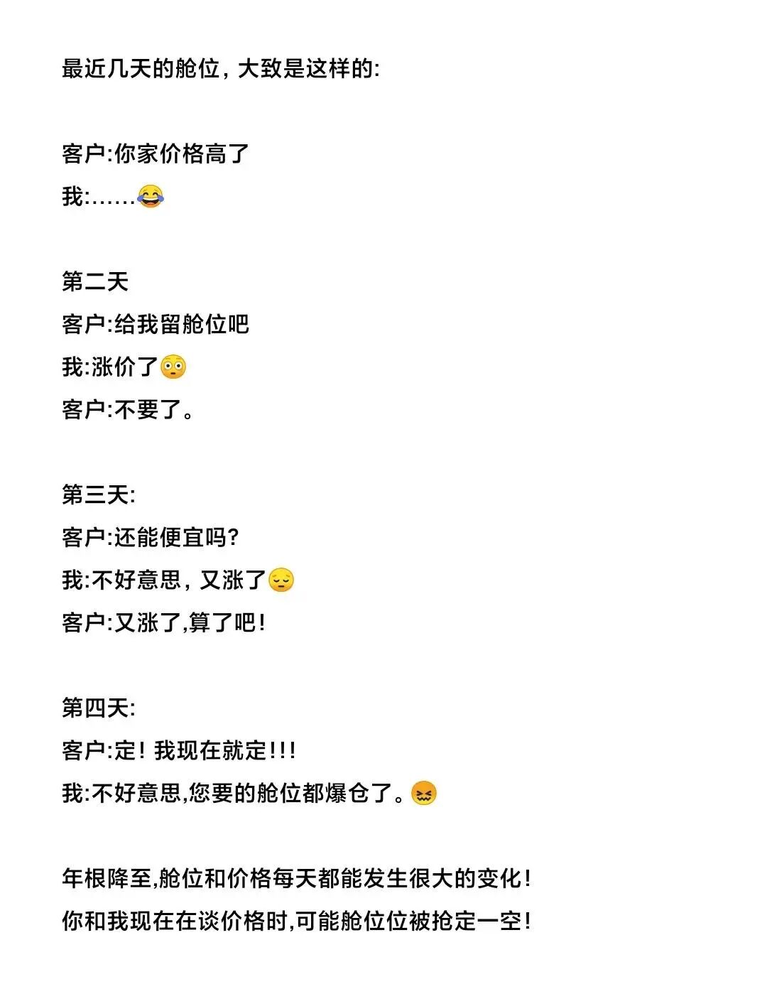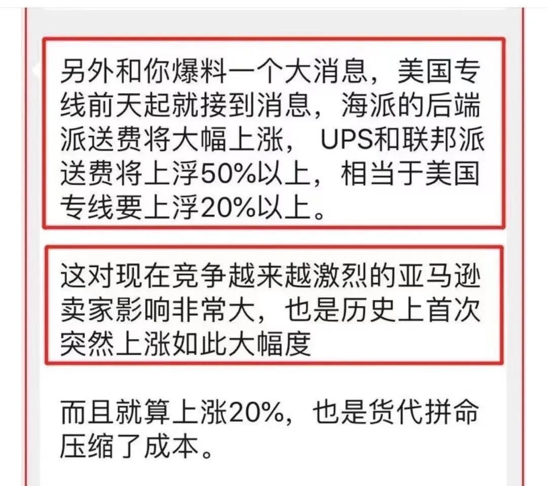 最近的物流价格真的是涨疯了!根据最新数据显示,美东航线市场运价已冲破USD 5000/FEU。 最重要的是欧美疫情反扑凶猛,空运和海运时效价格随时都会有很大的变化,美线价格更是更新频繁,卖家可能犹豫1秒,价格可能就不同了。 亚马逊卖家表示:“没想到节后到美国的船期比节前还爆仓,最近不要看价格了,能找到舱位就不错了。” 现在的舱位抢夺宛如购物秒杀,手慢的卖家根本抢不到,而且就算是卖家加钱也不一定能预订到柜子。 据亚马逊卖家反馈,目前长滩港口和洛杉矶港口异常拥堵,目的港罢工,南美运价4000多美元,澳洲4000多美元,美线4000-5000美元,连东南亚这种长年300-400美元的都已经涨到600-700美元了。 有业内人士预测,海运下阶段全国性欧洲破5、美西破5、美东和美中破6已经是大概率事件了。 有货代透露,以星海派本周已经爆仓,航司价格也再次上涨。对此,货代表示:“放弃降价幻想,准备迎接涨价,因为海运费和派送费真的还会再涨,从10月底甚至直到11月底,欧洲航线、美线、日本航线等都可能一舱难求。” 英国菲利克斯托港口当前已经出现拥堵(会出现在海上停留十天左右才能靠港的情况)和代理仓库爆满以及查验的情况,所以10月19日起深圳取消四截一开的船。灯类和插座类产品都会有较高的目的港查验风险。 目前,美国、加拿大和英国三个国家运价都飙升比较严重,集装箱短缺,让货物出口愈加困难。有些着急出货的卖家,已经被逼到直接亏本发联邦快递到目的国。 所以卖家近期一定要合理安排出货,提前一周或半个月通知安排定舱,和货代确定好价格,别等到需要发货在去临时订舱。 空运市场货多机少,价格大幅度上涨 除了海运,空运市场也不容乐观! 根据货代提供的信息显示现在的空运市场就是货多机少,涨价是大势所趋,一些货代公司已经陆续发出了运费涨价的通知,具体如下: 本月,美国空派包税价格将会有大幅度的涨价趋势。目前上海、郑州的价格都已经开始涨了,预计华南地区价格会在这几天内更新。请大家留意价格变动给您带来的不便。目前我们接到了欧洲、加拿大的空派价格上涨的通知,美国暂未接到具体的价格。 除此之外,现在的空运情况大概就是这个情况: 1、欧美目前有大量的项目货包机,APPLE、HUAWEI、XBOX等企业都有大批量的出货现象,这也会导致空运价格上涨,现在包括上海、郑州、南昌、长沙几大机场航司美线的价格均有上涨的趋势。 2、秋冬季欧美疫情卷土重来,防疫物资大量补货,空运渠道遭到挤压。 3、传统的黑五、圣诞节旺季许多大卖开始大量备货发货,Q4会非常爆。 UPS再度涨价,美国专线上浮20%以上 据货代爆料,美国专线已经从前几天就开始接到涨价的消息,海派的后端派送费将大幅度上涨,UPS和FedEx派送费将上浮50%以上,相当于美国专线上浮20%以上。 更让卖家崩溃的是,UPS已经宣布将在10月19日开始,通过涨价来调整UPS Peak Surcharges来以此应对持续的高峰货量,所以以星海派、美森海派、盐田海派以及后程用到UPS派送的,上调幅度每公斤1.5-2元。 反正,各种物流涨价通知是铺天盖地而来,不少亚马逊卖家直接懵了,因为利润被压缩的太过于严重,有些着急出货的卖家,甚至亏本直接采用快递发货。 对现在竞争越来越大的亚马逊来说,新手卖家是非常不易的,大家最好提前规划好发货问题,提前订舱,出货前注意价格变动。 最好,希望卖家和货代能够挺住这段时间,迎来物流行业春天。
