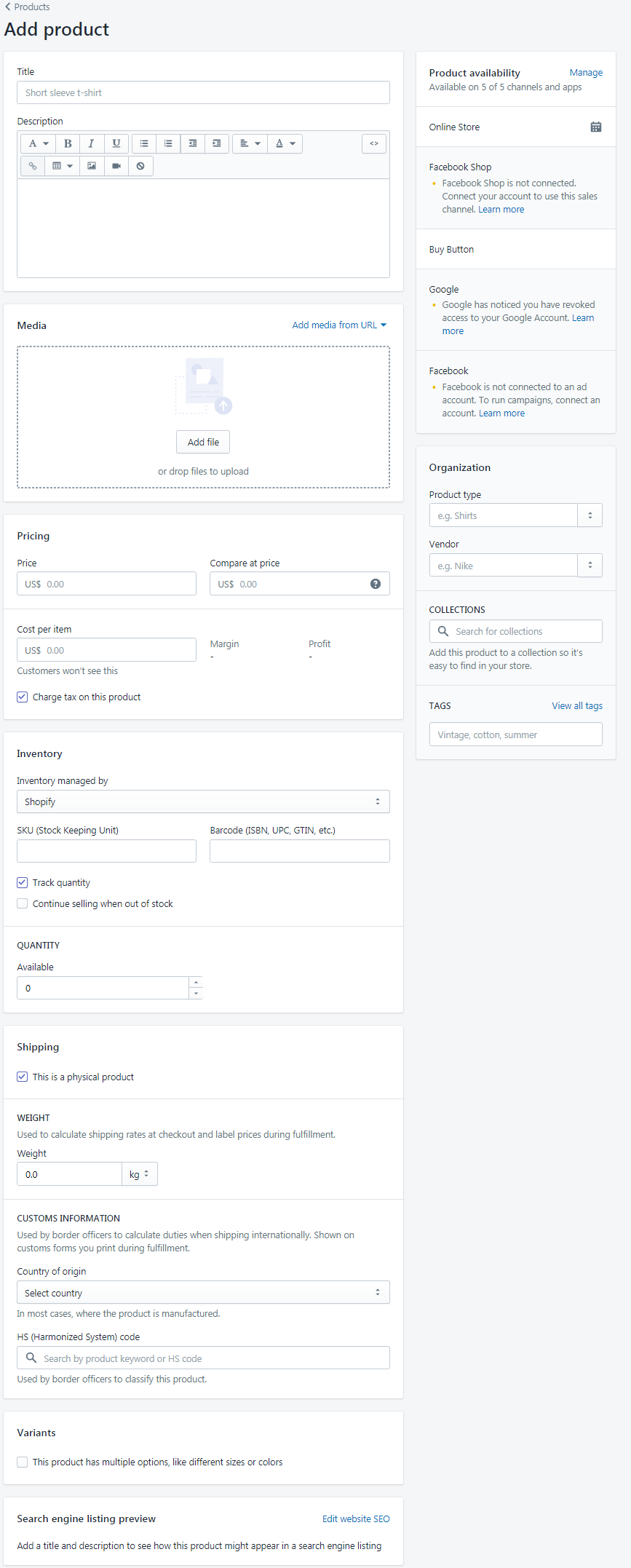 Track Quantity:追踪库存数量- 如果你只是使用Obelro来做Dropshipping,那么推荐勾选,方便你更好做库存管理,如果你的产品库存既要为Amazon,Wish等准备,也要开展Shopify销售,那么不建议勾选,要不然数据信息也不准确。