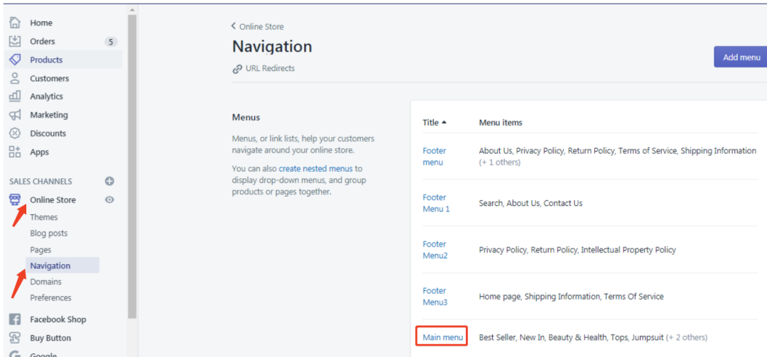 进入Shopify后台,点击Online Store - Navigation - Main menu