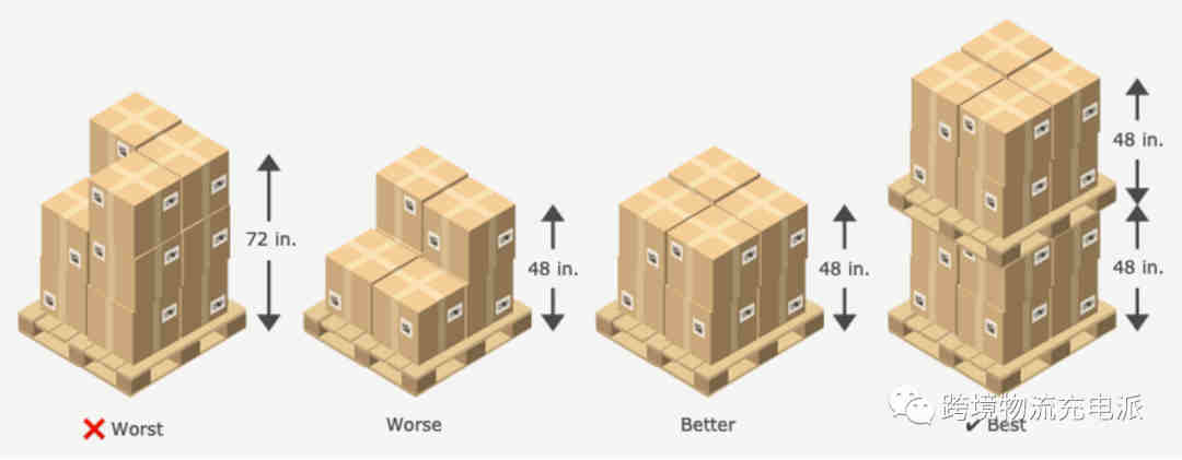 包装 要求 PART 01 一、纸箱包装要求 1.纸箱的尺寸要求:(1)北美站、欧洲站、中东站、印度站、澳洲站、新加坡站的箱子任意一边尺寸不能超过63.5 cm,除非单件货物本身的尺寸超过63.5cm。纸箱单件尺寸超过63.5 cm必须放进托盘上,除非单件可出运货物的纸箱尺寸超过标准的托盘尺寸。(2)日本站的纸箱尺寸标准不超过60cm x 50cm x 50cm。选择纸箱的尺寸要确保在货物放入后,剩余最少空间。不要发送尺寸像托盘尺寸一样的纸箱(Gaylords)。 2.纸箱的重量和标签要求:(1)北美站、澳洲站、新加坡站的单件纸箱包装的重量最多不超过23kg(市场一般限制在22.5kg)。若单件销售的商品重量超过23kg,则需要在纸箱上明确张贴“Team Lift”的标签,表示需要团队来操作;箱子重量若超过45kg,则需要在纸箱上明确张贴“Mech Lift”的标签,表示需要机器来搬运。(2)欧洲站、中东站的单件纸箱包装的重量最多不超过23KG。若单件销售的商品重量超过15kg,则需要在纸箱上明确张贴“Team Lift”的标签。箱子重量若超过23kg,则需要在纸箱上明确张贴“Mech Lift”的标签,表示需要机器来搬运。(3)日本站的要求是纸箱包装的重量最多不超过40KG。若单件销售的商品重量超过15kg,则需要在纸箱上明确张贴“Team Lift”的标签,箱子重量若超过30kg需要在纸箱上明确张贴“Mech Lift”的标签,表示需要机器来搬运。(4)印度站单件纸箱包装的重量最多不超过22.5kg,但印度站比较特殊,若是由亚马逊上门提货,则单个箱子重量需小于18 kg,且箱子尺寸不得超过 70 cm x 70 cm x 45 cm。若单件销售的商品重量超过18kg,则需要在纸箱上明确张贴“Team Lift”的标签,表示需要团队来操作;箱子重量若超过30kg,则需要在纸箱上明确张贴“Mech Lift”的标签,表示需要机器来搬运。 另外注意装有珠宝和手表的纸箱单件重量不能超过18KG。“Team Lift”和“Mech Lift”标签需彩色打印,且每边不小于8cm,样本如下图所示: 3.纸箱的包装材质要求:纸箱和内部包装材料(例如衬垫、填充物)必须在运输中充分的保护货物。若用不符合要求的包装发送至亚马逊,亚马逊将进行额外的包装并收取相应的包装费用。用大型尺寸的衬垫,例如空气枕,整张纸张,泡沫纸或者缠绕膜,不要用松散材质去填补,例如泡沫塑料、碎纸。纸箱不能用打包带,松紧带,胶带来捆绑,不能用大型订书钉或尼龙纤维胶带对纸箱固定或封口。 4.单个纸箱的PO/ ASIN/FNSKU数量:一个纸箱里面的商品应是同一个PO/ ASIN/FNSKU,并将包装箱标记为“Case Packed”。如果一个纸箱里面包含多个PO/ASIN/FNSKU的商品,最多只能涉及5个。 5.其他纸箱包装注意事项:纸箱被确定为一起销售的(例如套装产品)重量大于30kg必须被放在一个单一的托盘上(一个出售商品对应一个托盘上)并且需要在纸箱四面都张贴“超重”的警示标签;单件出售的纸箱货商品(例如家具、大型电器)重量大于30kg,通常都需要打托盘。警示标签必须张贴在纸箱四面合适的位置。 打托 要求 PART 02 二、托盘和打托要求 1. 托盘材质要求:需使用四向都能叉进的木制托盘(木材、胶合板、复合材料等),托盘需符合国际标准ISPM15(热处理托盘)。为了防止木头里面的昆虫物种入侵,木制的托盘必须是熏蒸托盘。不要使用脆弱材质的托盘,例如纸箱板和颗粒板。托盘不支持交换、退换和借用。需要使用符合GMA(Grocery Manufacturers Association,副食品生产联合会)B级或更高标准的托盘,使用GMA 1A等级托盘配送食品类商品。 2.单个托盘要求:(1)北美站、澳洲站、中东站、英国站、印度站、新加坡站:120cm*100cm (2)欧洲站(英国站除外):120cm*80cm(3)日本站:110cm*110cm 3. 打托高度和重量要求:(1)北美站、澳洲站、印度站、新加坡站、中东站单层托盘最高不超过180cm,总重量不超过680KG。(2)欧洲站单层托盘最高不超过180cm,总重量不超过500KG。(3)日本站单层托盘最高不超过150cm,总重量不超过1000KG。 注:以上打托高度均包含单个托盘高度(13-15cm),总重量均包含单个托盘重量(17-25KG)。 另外,在托盘能够安全进行装卸且不会在运输过程中造成商品残损的情况下,可以使用双层堆叠托盘。如下图所示,双层托盘堆叠的总高度不得超过100英寸,即254cm。 4. 其他打托注意事项:当把货物纸箱打托盘时,托盘上货件标签面朝外,以便于不用在损坏托盘情况下来扫描纸箱上的条形码。当一个托盘上有多个SKUs时,须将SKUs分开,这样就不会在收货的时候出现错误,同时可以在托盘上贴一张“MIXED SKU”的警示标签。托盘上堆叠纸箱要它们所有面都堆叠的齐平,推荐将最重的商品堆叠在底部。不要让纸箱超出托盘的边长,如果是单个商品超出,可以把2个托盘最短的一边捆绑一起时,需确保托盘短边那面朝向车子后方。用缠绕膜对纸箱打托,确保缠绕膜完全覆盖托盘上的商品,这样能预防在运输中移动以及确保堆叠的托盘在运输中稳定,使用透明塑料保障的缠绕膜为优先选择,不要使用黑色或不透明收缩膜。建议使用边角挡板,以便在运输过程中帮助保护并维持箱子的稳定性。 贴标 要求 PART 03 1. 粘贴商品标签:即最小销售单位的单品标签,又叫FNSKU,是X00开头的标签,须覆盖商品的原始条形码。在生成FBA订单的过程中按照所需数量打印,也可以在库存管理页面,勾选出相应的Listing。样本如下图所示: 2. 粘贴纸箱标签:需要货物的实际装箱数,在亚马逊后台系统设置箱数,然后打印出和箱数吻合的外箱标签,张贴在包裹外箱上,
