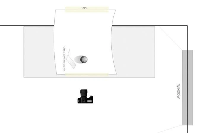 准备好装备后,就该设置拍摄区域了。将桌子放置在尽可能靠近窗户的位置,不要与窗台的阴影相交。你可以从与窗户垂直的方向向左或向右开始进行调整。离窗户越近,窗户越大,光线就越柔和。