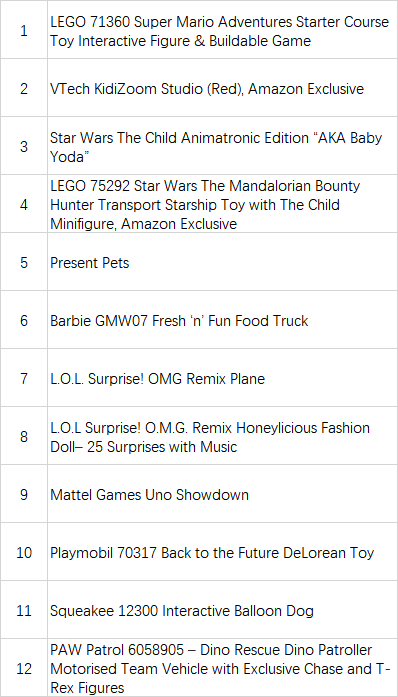 亚马逊公布2020圣诞Top12玩具清单