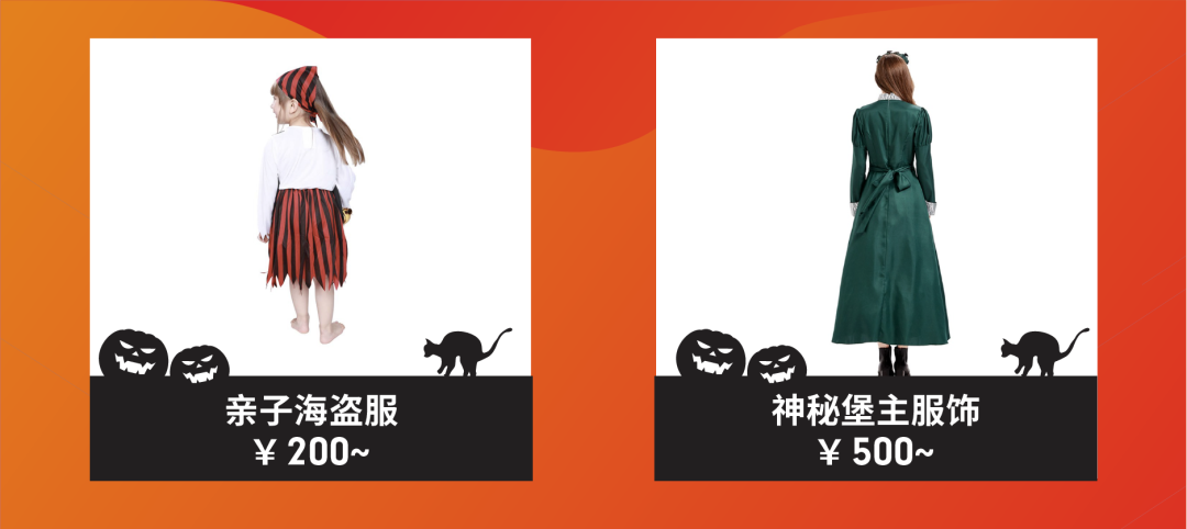 在这里,我们非常推荐以上两款可谓是“百搭”型的服饰:斗篷既可以扮作吸血鬼,又可以当作一些“巫师学徒”的装扮,差异就只在是不是长了尖牙,还是手里挥着根木棒子罢了。而右图上的复古面纱则常出现在恐怖女主的装扮中,偏哥特式的设计总能给装扮带来一丝吊诡的味道,但同时也不影响美感,深受女性消费者的喜爱。