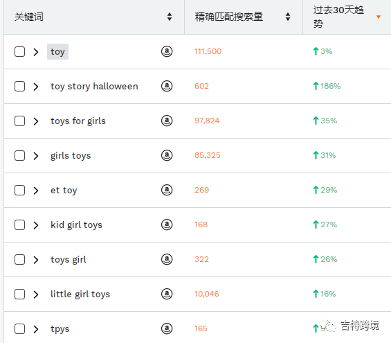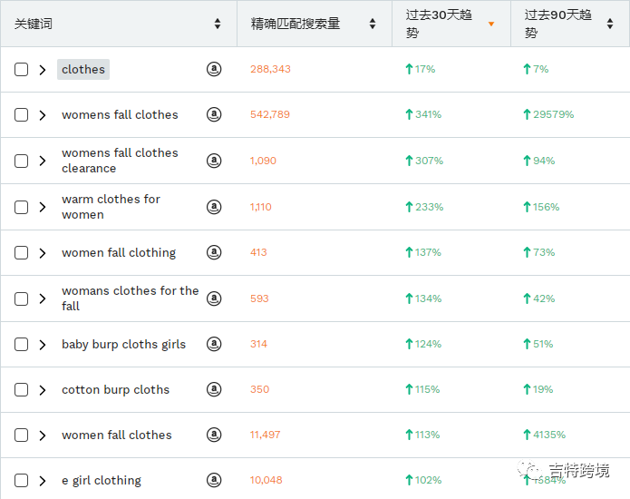 无论是近30天还是近90天,亚马逊上服饰类相关词汇的搜索都呈现普遍上升趋势,相信有不少服饰类目的商家都收货了不错的成果。
