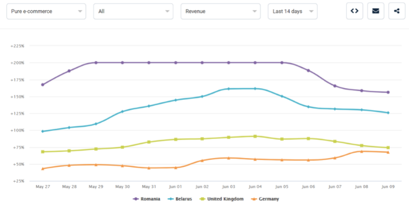 自疫情以来,德国电商收入年增长率已首次达到66%,德国电子商务和邮购商协会(BEVH)今年4月份曾发言称,德国电商销售额达到68亿欧元,同比增长17.9%。其中,在线食品贸易增长最快,销售额增长126.8%。德国大型消费电子产品零售商Ceconomy表示,在线销售额也增长了300%。德国在线时装零售商Zalando表示,时装销售已从疫情的最初打击中恢复过来,并预计其全年销售额将增长10-20%。