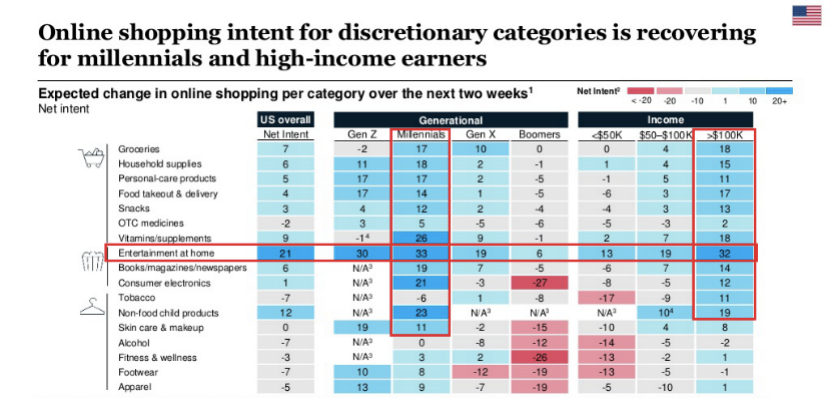 欧美国家是跨境商品最主要的海外消费国,为了更好的备战黑五,我们重点观察了今年上半年以来欧洲、美洲消费者的支出情况、消费品类变化、以及疫情对电商的拉动情况。我们发现,与国内情况相似,疫情造成线下门店关闭,居家时间延长,线上消费加速渗透,网购需求有了显著提升。受疫情影响,美国消费市场的需求显著向线上转移,2020年第一季度,电商渗透率飙升至27%,主要电商的销售额与订单量增速均达到历史新高点。从消费群体来看,千禧一代和高收入消费者的在线购物意向激增,家庭娱乐方面的需求尤甚,趋势值高达33%。同时,美国消费者计划增加食品、家庭娱乐、家庭必需品和个人护理方面的线上支出,生活必需品包括零食、杂货、儿童用品;非生活必需品包括珠宝、服饰;家庭娱乐包括在线视频娱乐、书籍报纸等。反观加拿大,情况则不那么乐观了。尽管有加拿大政府的经济支持,但在调查中,仍有44%的加拿大消费者强烈表示会削减支出,而47%的消费者表示会持谨慎态度,视情况消费。但封锁促使许多加拿大消费者去尝试新的服务,在购物渠道线上化方面进行探索,20%左右的消费者表示会增加线上消费。CCInsight数据显示,大部分欧洲国家的电子商务收入的年增长率都在10%-50%之间,欧洲市场的消费者普遍认为疫情的影响将持续超过5个月,即至少将持续到九月,因此需要削减不必要的支出,但家庭必需品、家庭娱乐方面的在线消费意向保持积极。而目前疫情已经成为常态,在线消费增长期拉长。英国消费者针对家庭娱乐类别的线上购物意愿最强,其次杂货、婴儿用品、个人护理的消费也呈现增长。32%的法国消费者在大多数非生活必需品上的支出都较低,而32%的消费者表示受疫情影响,会更加关注价格;同时,29%消费者表示在奢华设计品牌方面减少了支出。只有10%消费者表示在网上购买非生活必需品,9%的消费者在网上购买生活必需品。绝大部分的西班牙消费者对其健康和安全感到担忧,表示未来可能会对健康方面的品类增加关注。