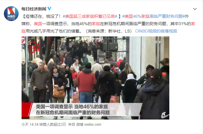外媒称,美国一项调查显示,当地46%的家庭在新冠危机期间面临严重的财务问题,其中31%的家庭用光或几乎用光了他们的积蓄。