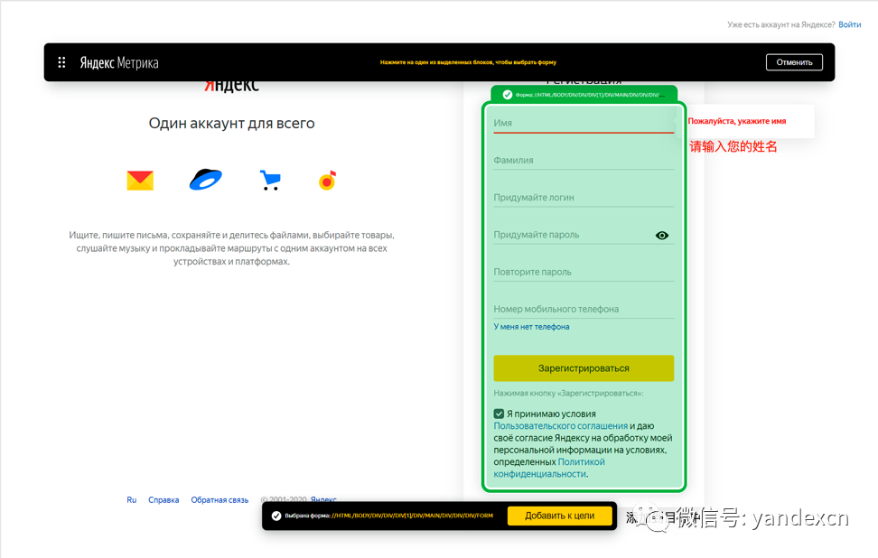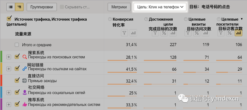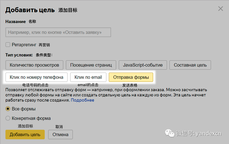 关于新目标的操作更详细信息请见Yandex帮助:电话话吗的点击,e-mail的点击,表格发送。