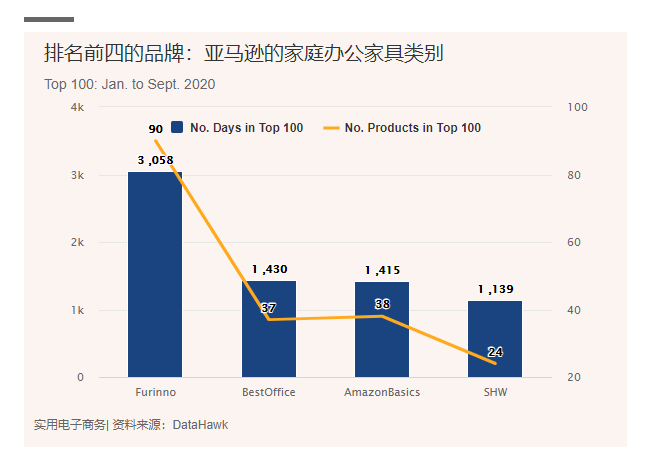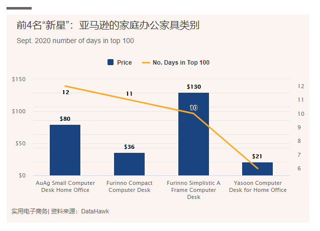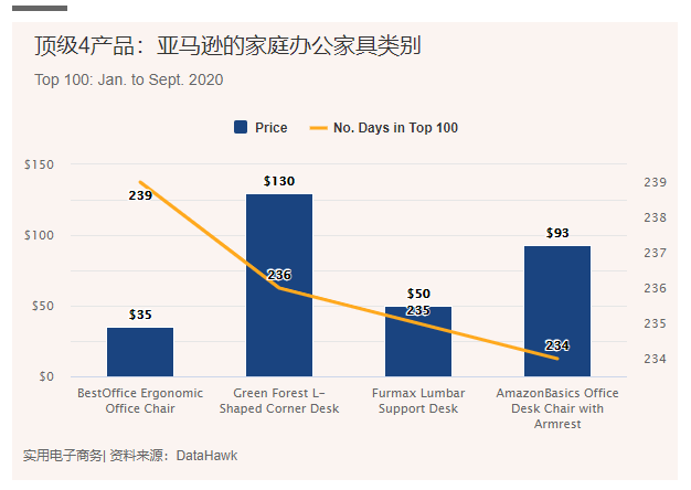 2. BestOffice 根据Google趋势,消费者对“办公椅”的兴趣一直在增长。BestOffice在亚马逊百强企业中有37种产品(主要是椅子),平均售价为87美元。 3. AmazonBasics 在“家庭办公家具”类别前100名中,AmazonBasic有38种产品上榜。具有较大目录的品牌具有更多的sku,因此也更有可能进入前100。在另一项根据“按产品列出的品牌存在率”指标中,BestOffice优于AmazonBasics。 4. SHW 尽管SHW的平均售价高达189美元,在百强榜单中,它依然有24种产品。这表明,相较于其他产品的价格便宜,SHW在品牌方面享有很高的声誉。 接下来,我们来看看家用办公类别的中最畅销的产品有哪些? 1. BestOffice 的人体工学办公椅 自1月份以来,该产品的最佳销售排名为4,最低排名为63。 价格:$ 42.99 评论:5,016 星级:4.3 / 5 2. 绿色森林 的 L形转角办公桌。 一月以来的最佳销售排名是2,最差的排名是88。 价格:129.99美元 评论:7,185 星级:4.3 / 5 3. Furmax的腰部支撑台。 一月以来,最高的销售排名是1,最低的排名是61。 价格:49.99美元 评论:11,870 星级:4.0 / 5 4. Amazon Basic的办公椅。 一月以来的最佳销售排名是2,最低的是78。 价格:$ 92.60 评论:10,827 星级:4.2 / 5 总的来看,该类别最畅销的四个产品中有三个都是椅子。 除上述提到的品牌,在家庭办公家具品类Best Seller前100名中,也有一些“后起之秀”表现亮眼,以下是排名前四的“新星”产品。 1. AuAg 小型电脑家庭办公桌。 AuAg自身以其优质的游戏桌而闻名。在疫情爆发期间,AuAg为在家办公的人群设计开发了一张小桌子,结果非常有效。该款办公桌于今年5月首次上架,如今已获得500条评论,且评级在4.6星,而这或许归功于其79.99美元的价格。 2. Furinno紧凑型电脑桌。 这是榜单上的另一种小桌子。这种书桌在居住于空间有限的公寓中的城市人群中很受欢迎。 3. Furinno简约框架电脑桌。 又一个Furinno办公桌!截至八月下旬,该listing只有3条评论,且仅有3.3星。不过,它在9月份连续三天在百强中排名第四。 4. Yasoon家庭办公室用电脑桌。 该家庭办公室办公桌于9月11日首次出现在亚马逊上。尽管目前仅有2条评论,但它仍跻身前100名。