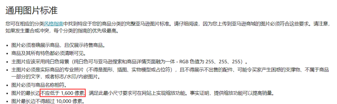 亚马逊卖家请注意,图片像素标准政策有相应更新,要求Listing图片的最长边不应低于 1,600 像素。满足此最小尺寸要求的图片可在网站上实现缩放功能,能够帮助卖家提高销量。