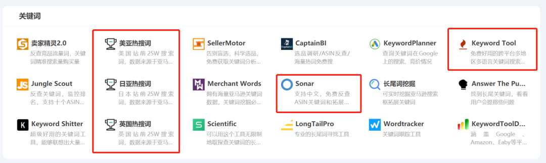 说到这就不得不提到我们的网站了,在卖方通卖家导航上,就有许多实用且免费的工具、插件等,如下图的关键词工具、免费插件等。