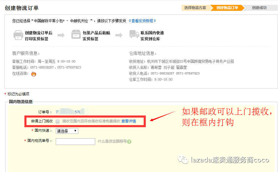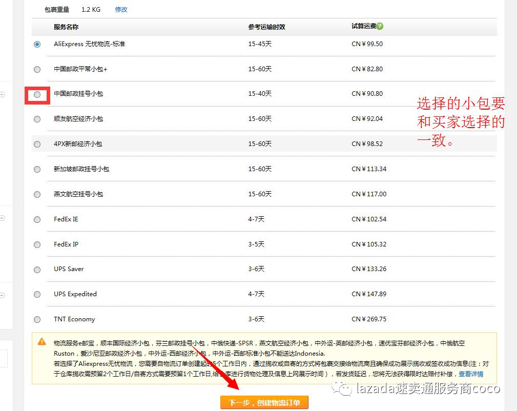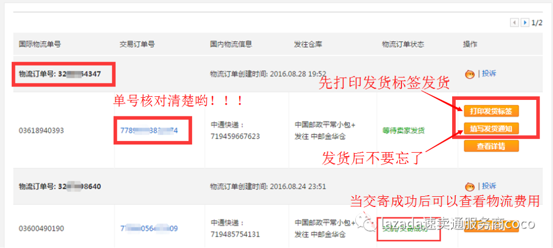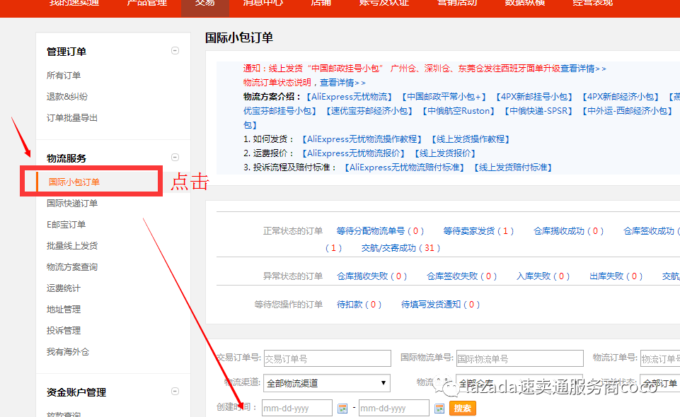 步骤4:点击物流服务中的国际小包订单,打印发货标签,并填写发货通知