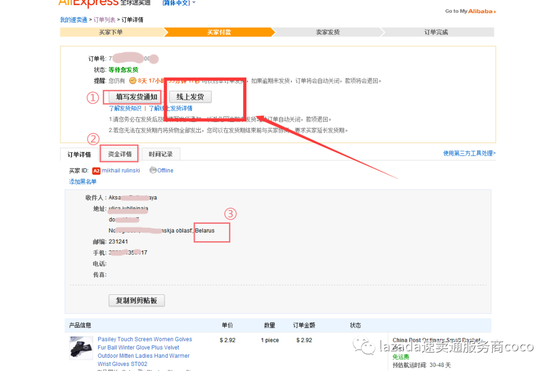 ③ 买家详情可以查看一下是哪个国家选购了你的产品哟,订单多了之后可以分析你的产品在哪些国家比较热卖,这样可以针对这些国家的客户进行二次开发,增加店铺成交率。地址上可以查看买家是哪一国的,如图“Belarus”(白俄罗斯)