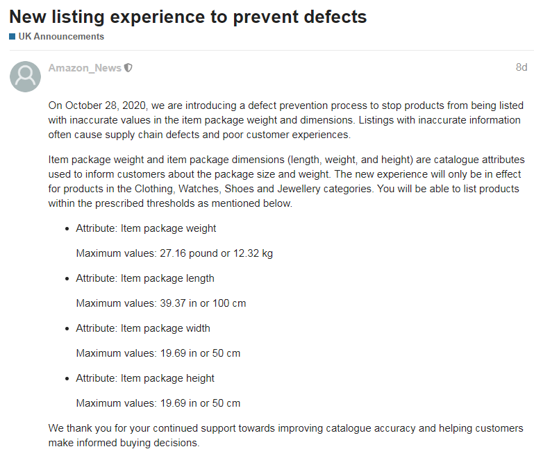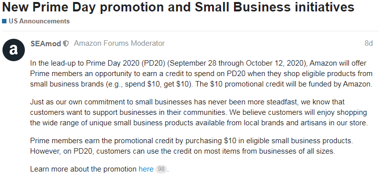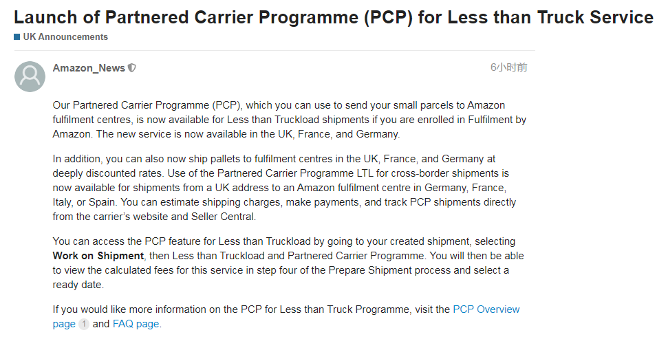 现在卖家可以通过广告平台访问广告管理,包括推广广告活动、品牌旗舰店和广告报告。此项更改使您可以更全面地查看广告活动选项,更快地找到所需内容并更有效地进行广告投放。 1、更容易导航 当您登录广告平台并将鼠标光标悬停在菜单图标上时,平台左侧会出现导航菜单。您可在其中快速访问您的广告活动、品牌旗舰店、报告,以及进行批量操作。您的账单和付款方式现在也位于一个集中位置。 图源/亚马逊 2、新的通知和支持功能 在广告平台中,您可以访问专属于该平台的功能。其中包括有关正在投放的广告活动的实时通知、广告主特定支持的指定位置,以及在区域内所有账户之间无缝切换的功能。 图源/亚马逊 3、您还需要知道什么 只有广告管理(包括推广广告活动、品牌旗舰店、广告报告、付款设置和账单)移动到了广告平台。在卖家平台和广告平台中,您的所有设置和信息保持不变。 您可以从卖家平台的菜单轻松访问广告平台,并随时从广告平台导航返回卖家平台。 您的登录信息将保持不变,无需单独的账户。 您有一个专门的位置来获得广告专家的支持。广告问题将同时在卖家平台和广告平台中显示。 二 亚马逊透明计划 扩展到日本和澳大利亚站 透明计划是亚马逊推出的产品系列化服务,以确保消费者在亚马逊平台上购物时收到的都是正品,而不是仿冒品。 船长了解到,目前该服务正在扩展到日本和澳大利亚站点。这也就意味着美国、加拿大、德国、法国、意大利、西班牙、英国、澳大利亚、日本和印度站点的卖家都可以使用透明计划了。同时,亚马逊还表示将进一步开发新功能,使其使用和注册更加简单。 图源/透明计划官网 根据官方的说法,透明计划允许品牌商通过在产品或其包装上应用唯一代码来标识他们生产的每个产品。这些代码使亚马逊能够对每一个参与透明计划的产品进行检查和认证,从而防止假冒商品流到客户手中。此外,无论他们在哪里购买产品,客户都可以使用移动应用程序来扫描代码并验证真实性。迄今为止,透明度已经阻止了超过50万个涉嫌假冒商品在已注册品牌中的发货。 三 简化跨境销售流程,美国FBA库存 可配送加拿大和墨西哥的订单 近日,亚马逊发布公告宣布,为简化跨境销售流程,创建了一项物流(FBA)新计划,该计划允许卖家使用美国FBA库存对加拿大和墨西哥订单完成远程配送,省去了管理多国库存、跨境物流和进口关税的麻烦。 图源/亚马逊卖家论坛 运作方式如下: 您在Amazon.ca或Amazon.com.mx上创建的任何报价都会自动从您的美国库存中提取,除非该商品已经在加拿大或墨西哥的运营中心,亚马逊会通知您哪些ASIN符合资格。 客户支付进口税作为购买价格的一部分。 亚马逊将您的订单直接运送给加拿大和墨西哥的客户。 要参与该计划,请访问以下页面: https://sellercentral.amazon.com/rafn/inventory(复制到安全浏览器环境下打开) 有关更多信息,包括额外的费用,请访问以下帮助页面: https://sellercentral.amazon.com/gp/help/G5P3CDUHZWSZLXLB(复制到安全浏览器环境下打开) 如果您不是亚马逊FBA卖家,则可以访问“通过亚马逊物流帮助发展您的业务”来查找信息并进行注册: https://services.amazon.com/fulfillment-by-amazon/benefits.html(复制到安全浏览器环境下打开) 四 亚马逊启动合作承运人计划(PCP) 比卡车服务更便宜 如果您使用了亚马逊FBA配送服务,就可以参与合作承运人计划(PCP)将小包裹发送到亚马逊运营行中心。这项新服务现已在英国,法国和德国提供。 图源/亚马逊卖家论坛 此外,您现在还可以极低的折扣将货盘运送到英国、法国和德国的运营中心。从英国地址发货到位于德国、法国、意大利或西班牙的亚马逊运营中心,使用合作承运人计划LTL进行跨境运输。您可以直接从承运人的网站和卖家平台估计运费、付款和跟踪PCP发货。 五 亚马逊推出 Prime 会员日小企业促销计划 亚马逊鼓励消费者在其市场上从小企业购买商品,并在即将到来的Prime Day购物活动中推出了一项有趣的促销活动。 2020年9月28日至10月12日,Prime会员如果在特定小企业的商品上消费10美元,就可以在Prime Day获得10美元的的抵免额,适用于在亚马逊或亚马逊APP上购物,但不能用于购买电子书、酒精、亚马逊礼品卡、订阅、税收、运费、礼品包装费用、Prime会员资格、数字产品或Prime Now订单,其他排除条件可能适用。 图源/亚马逊卖家论坛 促销并不适用于所有小卖家的所有商品。亚马逊建立了一个目标登陆页面,Prime会员可以按产品类别、地理区域和小型企业(女性拥有、创新者、黑人拥有、军事家族拥有、家族拥有和制造商)的类型购物。 这项计划或有助于吸引更多的卖家进入其市场。在促销的目标页面上,有一个链接“可以了解有关在亚马逊商店中销售的更多信息”。 六 亚马逊将引入缺陷预防流程 以杜绝不良客户体验 2020年10月28日,亚马逊将引入缺陷预防流程,以防止商品在包装重量和尺寸上出现不准确的数值。信息不准确的Listing经常导致供应链缺陷和糟糕的客户体验。 图源/亚马逊卖家论坛 商品包重量和尺寸(长度、重量和高度)是用于通知客户包装尺寸和重量的目录属性。新的流程仅对服装、手表、鞋子和珠宝类别的商品有效。 七 亚马逊发布Prime Day 节日礼物指南 船长获悉,亚马逊为下周10月13日至14日的Prime Day及时发布了节日礼物指南。在10