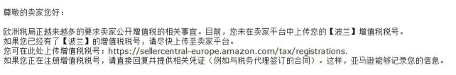 邮件通知要求上传波兰税号,否则限制建仓。受影响的基本是开通泛欧计划、不限制德国出口、使用了波兰捷克仓、在销往波兰国家的卖家。