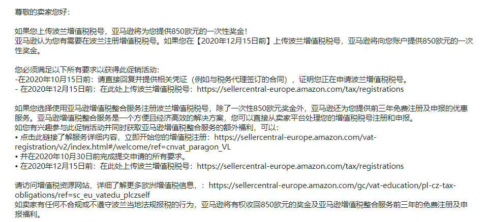 亚马逊发放了第一波邮件“【重要通知】上传您缺少的【波兰】增值税号,并获得官方补贴”。将陆续随机发放第二波邮件,收到邮件的卖家都有机会获得850欧元的补贴。
