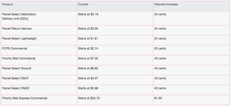 1. 包裹选择目的地送货单位、退回服务以及轻量计划涨价24美分; 2. FCPS商业计划涨价25美分; 3. 优先邮件广告、包裹选择地面、DSCF和DNDC计划涨价40美分; 4. 优先邮件快递商业则计划涨价1.5美元。