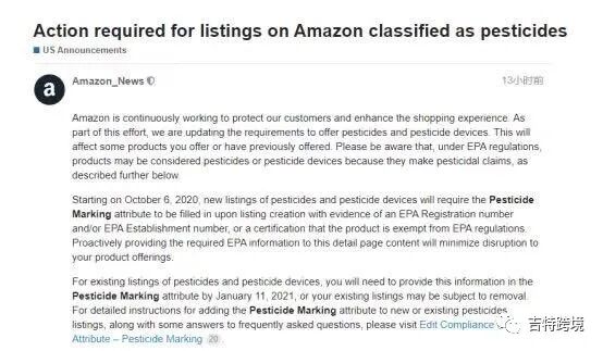 对于农药和农药设备的listing,卖家需要在2021年1月11日之前在“农药标记”属性中提供EPA信息,否则卖家的现有listing可能会被删除。