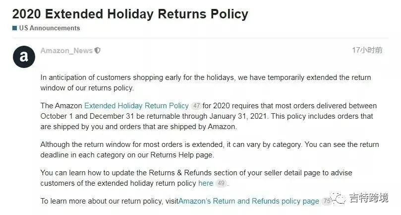 此项政策在9月中旬时候就有过相关通知,本月开始正式实行,虽然说亚马逊这么做是为了旺季更好的客户体验,但是却可能会在无形中增加卖家的退货率,因此很多卖家对其并不看好。