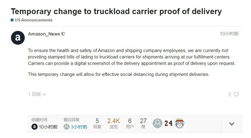 而亚马逊此前也多次传出物流中心工人感染新冠病毒的新闻。美国食品和商业国际联合工会主席马克·佩隆表示,亚马逊这一数据反映美国企业在这场疫情中对一线员工的保护“完全失败”。 为了避免感染新冠病毒,保障员工的健康与安全,10月8日,亚马逊美国站发布一则有关货物承运人交货证明的公告,公告内容如下: 为了确保亚马逊和运输公司员工的健康和安全,亚马逊目前不向运抵亚马逊运营中心的货物承运人提供带盖章的BOL(提单)了,承运人可以请求电子版的“递送预约”作为妥投证明。 这一临时的变化可以让货物运送过程中的人员有效地保持社交距离。 公告原文截图如下: 对于在亚马逊工作的员工来说,这一政策是符合逻辑的,可以有效预防新冠病毒的传播。但是对于走卡派的卖家来说,如果遇到丢货,申请异议调查会比较困难。因此,有卖家表示,亚马逊还是应该安排一些工作人员做好防护措施,专门负责确认,以防卖家在货物丢失的情况下没有追索权。 值得注意的是,美国的疫情现状,对于跨境卖家来说,或迎来新一轮物流延迟,Prime Day临近,跨境卖家们要时刻紧盯亚马逊政策变化,早做准备。