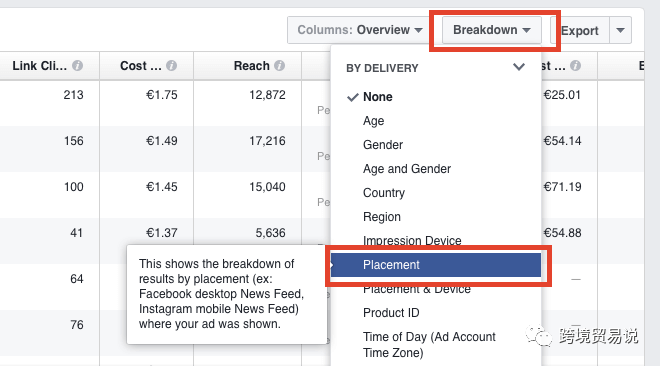 选择Facebook Ads Manager的广告系列视图查看过去30天内哪些展示位置获得了最佳效果。![]()