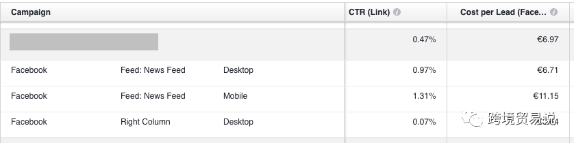 查看结果时,你要找到效果最佳和效果最差的广告展示位置。例如,在下图中,你可以看到移动广告展示位置的每次导入成本比桌面展示位置高出约90%。
