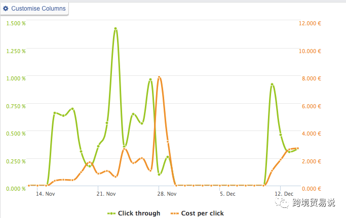 首先明确你的Facebook广告系列是否产生了希望的效果。例如,下图显示了28日前后每次点击费用大幅增长。