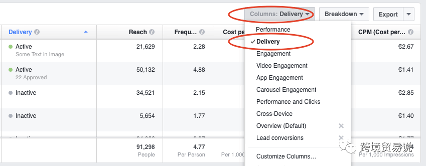 如果你的广告频率超过3,你需要调整广告组的受众群体或更改广告素材。![]()