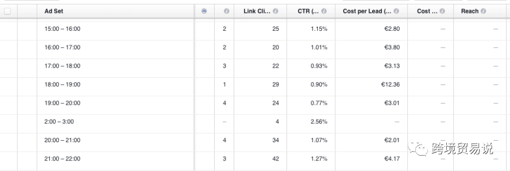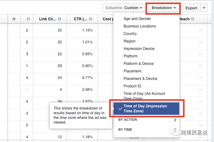 登录到你的Facebook Ads Manager并选择一个广告组按照广告展示时间维度细分广告投放效果。![]()