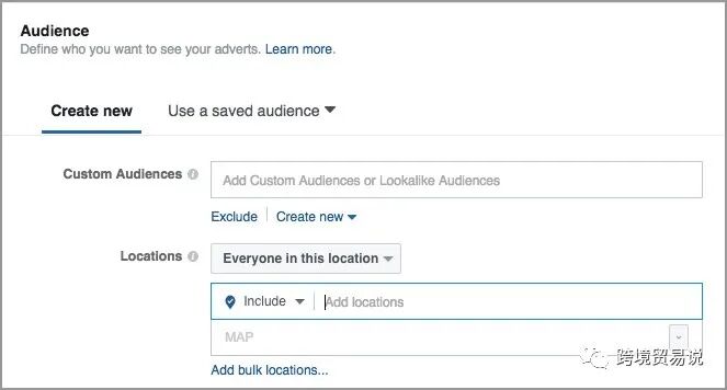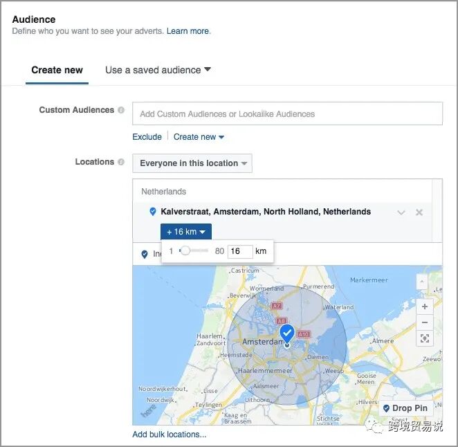 4、设置受众。要使用地区定位,请在包含右侧输入您的店铺地址。使用滑块调整指定地点周围的半径范围。从下拉菜单中选择一个选项,以包含或排除该区域内的居民或访客。