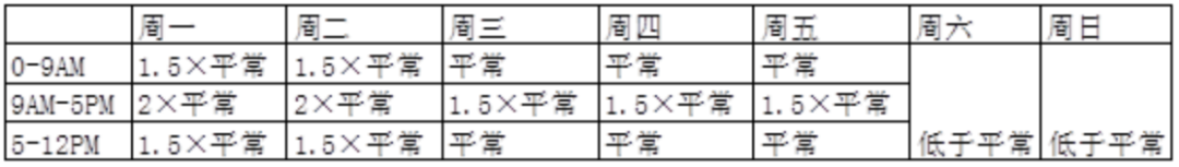 高峰期WEEKDAYS:9AM – 5PM(几乎是其余时间的两倍),把预算调成平常的1.5倍