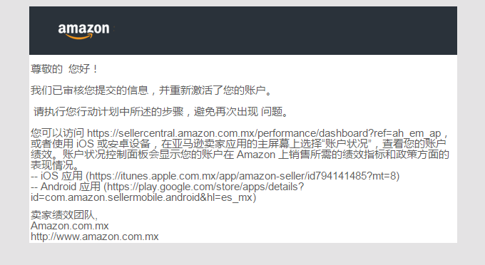 4、如果申诉失败,再有招商经理的前期下,先与招商经理再次沟通,准备资料进行第二次申诉。如果是自注册,先核对一下信息这些有没有填错同时分析一下原因?如果没有申诉按钮,或没有地方提交申诉材料。 请发送申诉邮件至seller-performance@amazon.com进行提交。