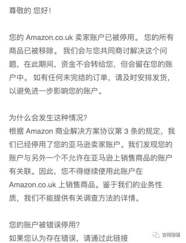 “您好!您的亚马逊卖家账户已被停用。您的所有商品已被移除。我们会与您共同商讨解决这个问题,在此期间,资金不会转给您,但会留在您的账户中。如有任何未完结的订单,请及时安排发货,以避免进一步影响您的账户。为什么会发生这种情况?