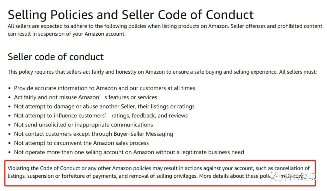 (违反行为准则或任何其他亚马逊政策可能会导致对您的帐户采取行动,例如链接下架、暂停或没收资金以及取消销售权)