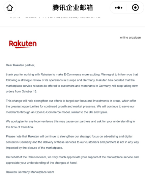近日,一些卖家表示收到了德国办公室发来的通知称,乐天将对其在欧洲和德国的业务进行战略性审查,因此从10月15日起,将停止接受新的订单。