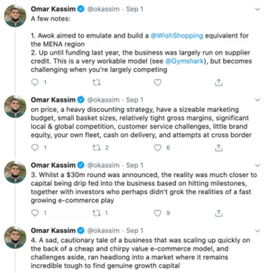 但中东创投圈有影响力的人物Omar Kassim却认为Awok倒闭罪的魁祸首就是在一个没有多少真正的成长期资本的区域试图去快速成长,导致高获客成本、低客单价、自营物流的成本高。