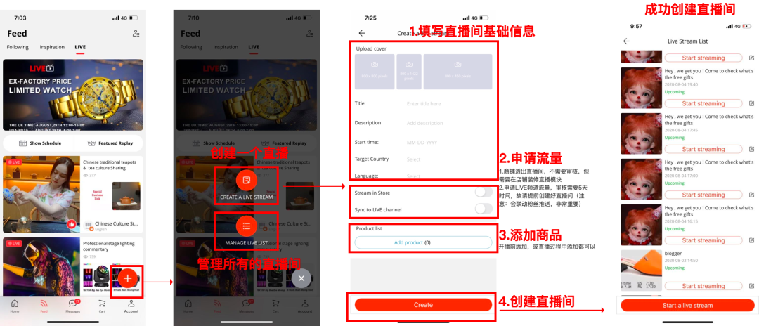 ! 一、开通AliExpress直播功能 第1步 直播权限都必须经过卖家申请,金银牌速卖通卖家已经在2019年10月9日统一开通直播权限了(除店铺有成人用品的店铺外),非金银牌的商家在下方链接里填写申请信息,我们会在3-5个工作日开通直播权限。(金银牌商家仍没有直播权限的也按以下链接申请直播权限) 直播权限申请链接: https://survey.aliexpress.com/apps/zhiliao/bone6EO8 第2步 测试直播功能是否开通成功,卖家可以进入直播创建链接,检查自己能否正常访问直播创建链接判断账号是否获得直播权限。 直播创建链接: https://live.aliexpress.com/livebackend/liveRoomList.htm ! 二、创建AliExpress直播并开始直播 创建直播 第1步:获得直播权限后登陆AliExpress App,在AE APP点击底部第二个TAB "FEED",然后在"FEED" TAB下,点击LIVE。可以在右下角看到“创建直播”入口。 第2步:填写基本信息:直播标题,直播内容简要介绍,直播开始的日期和时间,直播时的语言,直播目标国家,上传相关封面。添加直播间商品,并同步直播到店铺首页。 PS:如果需要更多流量,请务必不要创建直播间后马上开播,live频道展示直播需要等到5个工作日审核通过。 粉丝推送流量条件: (1)开播前,务必提前10天创建好直播间,认真选择直播语种(官方只为语言与直播语种匹配的用户发推送); (2)点击申请更多流量,大约一周会产生审核结果; (3)开播。开播后,我们会自动给您的粉丝发送推送提醒其来观看。 开始直播 选择直播推流方式 1、OBS: 点击AE直播的“使用OBS直播”,在弹出的提示框中可以看到服务器地址和密钥,打开OBS软件,依次点击:设置—串流。服务选择“自定义”,将AE直播间的URL和Key复制到OBS的“服务器”和“串流密钥”框中,点击确认。横屏直播分辨率:1920*1080,竖屏直播分辨率:1080*1920(依次点击:设置 – 视频 ,修改基础分辨率)。点击OBS软件上的“开始推流”后,画面将通过OBS推送到AE直播中控台的监播上。确认在中控台监播里看到画面后,点击中控台的“正式开播”按钮,用户就能看到直播画面了。 2、手机直播:点击“用手机直播”,弹出推流二维码。该二维码就是推流地址,主播使用最新版iOS AE客户端扫描二维码,预览画面。看到画面后,点击屏幕上的红色按钮,提示变Started则开始推流。确认能在中控台监播里看到画面后,点击中控台的“正式开播”,用户就能看到直播画面了。 3、其他软件直播: XSplit Broadcaster (Windows only): https://www.xsplit.com/#gamecaster Wirecast Play : https://www.telestream.net/wirecastplay/landing.htm PS:结束直播一定要注意操作顺序,先点击AE直播的“结束直播”,再结束手机端推流或者OBS推流!然后便可编辑直播及发布回放。 ! 三、AliExpress直播其它相关问题 直播审核