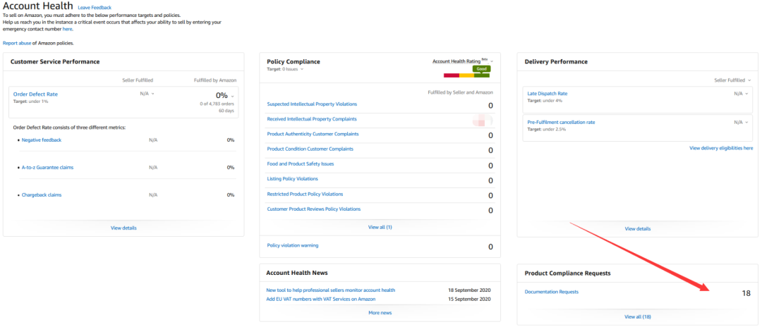 同时,卖家也可以直接在后台按照如下步骤查找:绩效->账户状态->商品合规性请求。