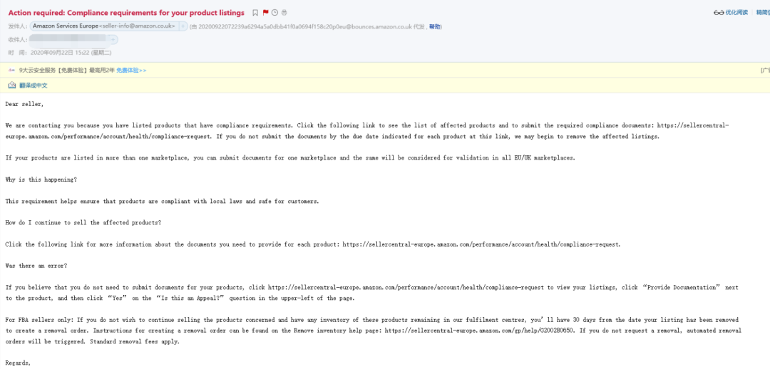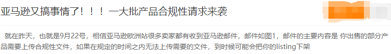 据卖家爆料,9月22日,亚马逊欧洲站卖家收到亚马逊邮件,称卖家出售的部分产品需要上传合规性文件,如果卖家在规定的时间内无法上传需要的文件,卖家的listing将会被下架。